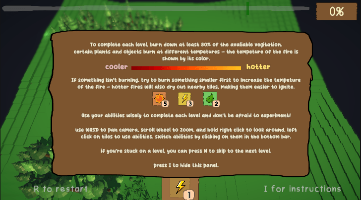 Created October 2023 in one weekend by a 2 person team. I was responsible for the programming, design, UI, and sound. The game features a cellular automata style fire spread system that takes into account the amount of fuel and humidity on each tile, which was a fun challenge to create and helped set the game apart from similar titles.